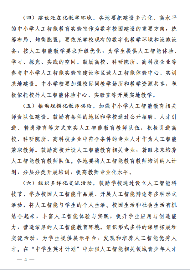 · 鼓勵學校通過多種形式活動豐富AI體驗與實踐。組織課程拓展和交流活動,為學生提供展示平臺。在“中學生英才計劃”中加強AI相關領域青少年人才培養(yǎng)。