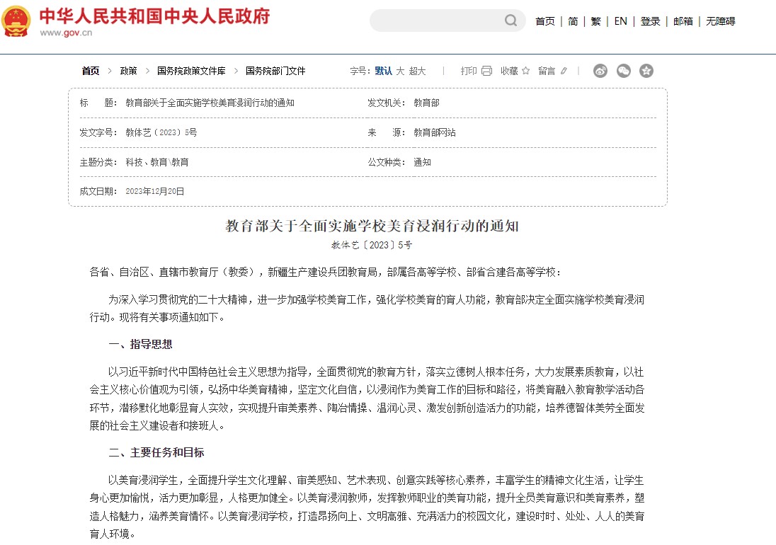 教育部印發(fā)《關(guān)于全面實(shí)施學(xué)校美育浸潤(rùn)行動(dòng)的通知》(教體藝〔2023〕5號(hào)),全面實(shí)施學(xué)校美育浸潤(rùn)行動(dòng),包括實(shí)施美育教學(xué)改革深化行動(dòng)、美育評(píng)價(jià)機(jī)制優(yōu)化行動(dòng)等,進(jìn)一步加強(qiáng)學(xué)校美育工作,強(qiáng)化學(xué)校美育的育人功能。此文件也為未來(lái)一段時(shí)間內(nèi),各個(gè)層面美育工作的開展指明了方向。加之之前《關(guān)于全面加強(qiáng)和改進(jìn)新時(shí)代學(xué)校美育工作的意見》文件內(nèi)容,藝術(shù)素質(zhì)測(cè)評(píng)的實(shí)施,有助于推動(dòng)學(xué)校開足開齊藝術(shù)相關(guān)課程及促進(jìn)教育教學(xué)改革相關(guān)工作。